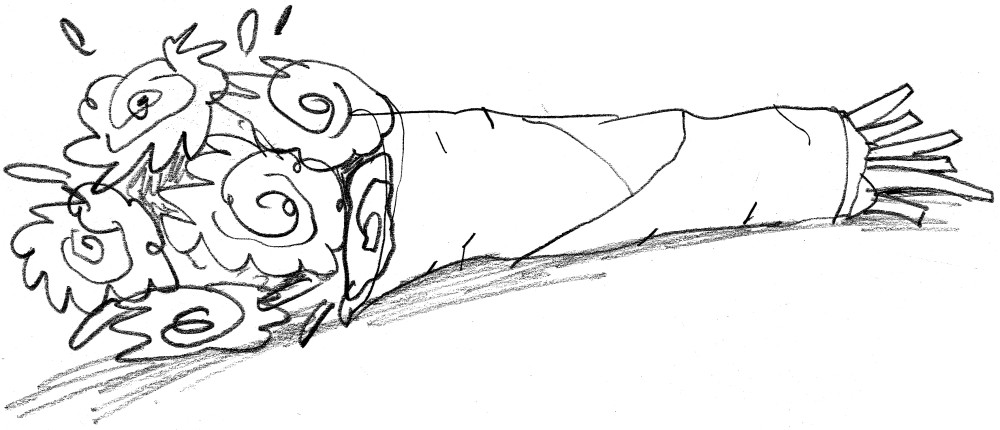 ‘Nou, verder niks eigenlijk. Alleen deze.’ Ze steekt de bloemen naar voren.